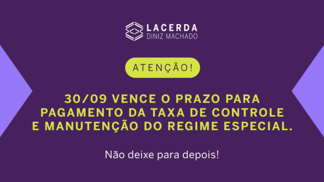 Atenção: Prazo para pagamento da Taxa de Controle e Manutenção do Regime Especial vence no dia 30 de setembro